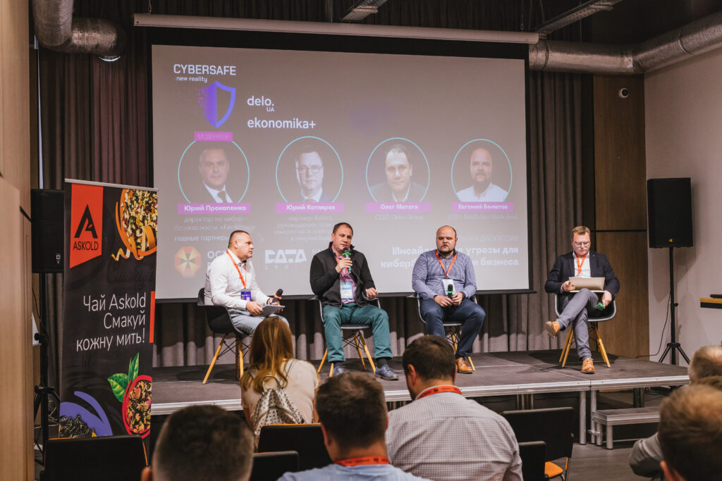 Инсайдерские угрозы для кибербезопасности бизнеса в формате панельной дискуссии обсудили: директор по кибербезопасности «Киевстар» Юрий Прокопенко, CISO Okko Group Олег Матата, CISO Raiffeisen Bank Aval Евгений Балютов, партнер Asters, руководитель практики технологий и электронных коммуникаций Юрий Котляров.
