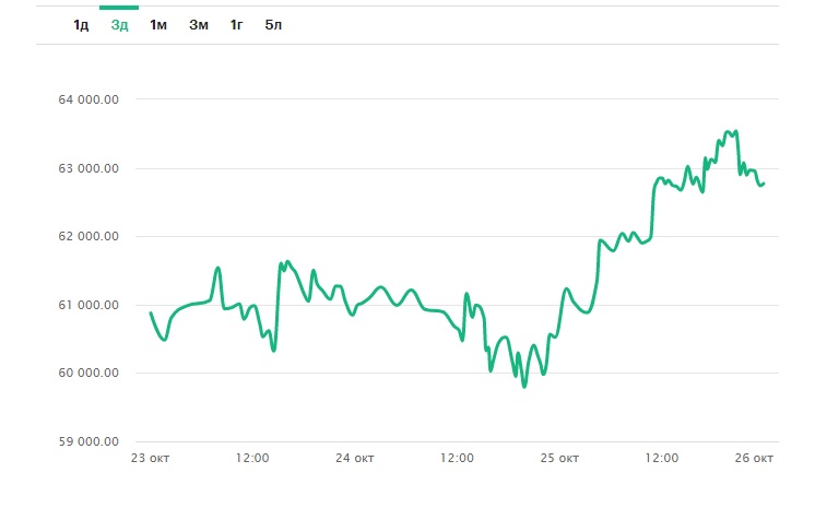 На прошлых выходных цена биткоина опустилась до $59,5 тыс. По состоянию на полдень 25 октября актив торговался по $62,7 тыс. За одни сутки стоимость криптовалюты увеличилась на 3%.