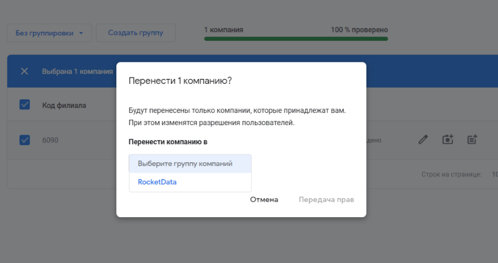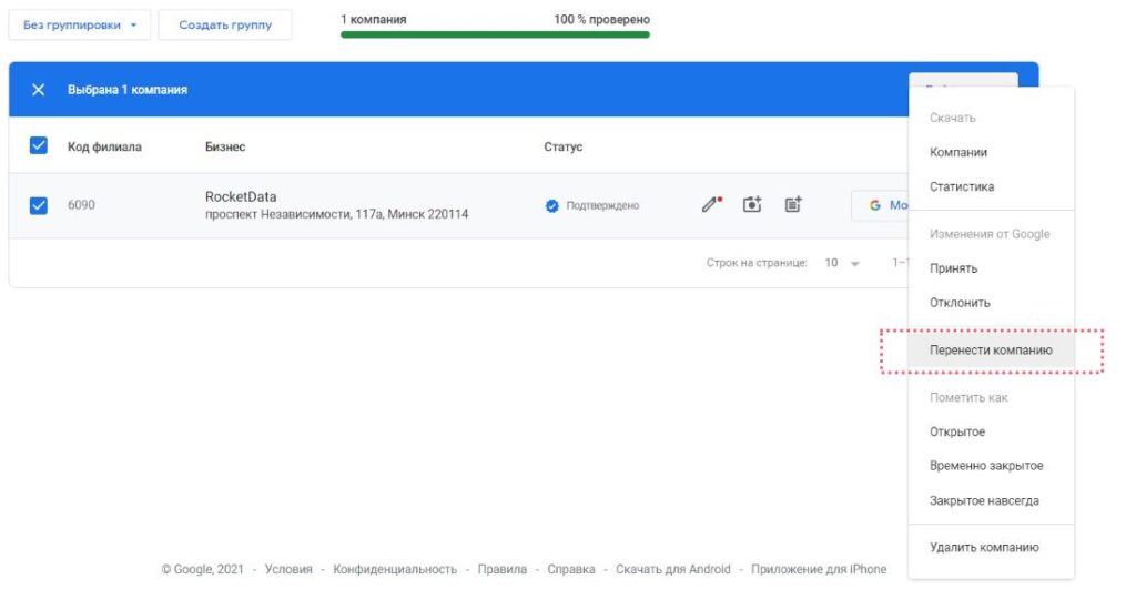 Если локации уже были ранее добавлены в GMB, перенесите их в созданную группу адресов. Для этого нужно выбрать все адреса, нажать на выпадающий список и затем – на кнопку «Перенести адреса».