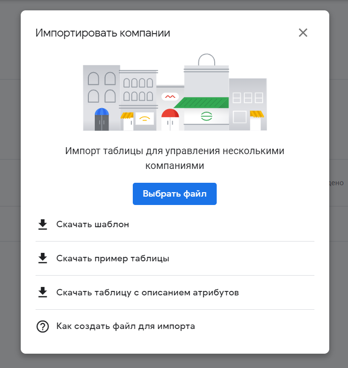 Шаг 1. Для массового добавления карточек в GMB потребуется собрать данные о них в одном файле (таблице) и загрузить его в личный кабинет. Для получения файла нужно выполнить следующие действия: