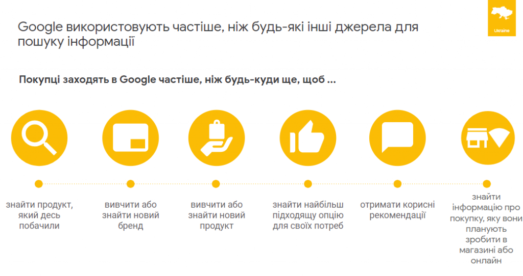 В рамках проведённого исследования компанией Ipsos по заказу Google стало известно, что поисковую систему Google украинские пользователи Глобальной сети используют для поиска информации о товаре и рекомендаций намного чаще, чем другие источники.