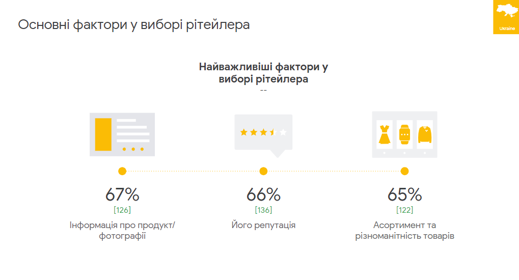 Украинцы чаще всего оформляют заказы в магазинах, в которых представлена полная информация о товаре и присутствуют его фотографии (67%), заслуживших хорошую репутацию на рынке (66%) и предлагающих большой ассортимент товара (65%).